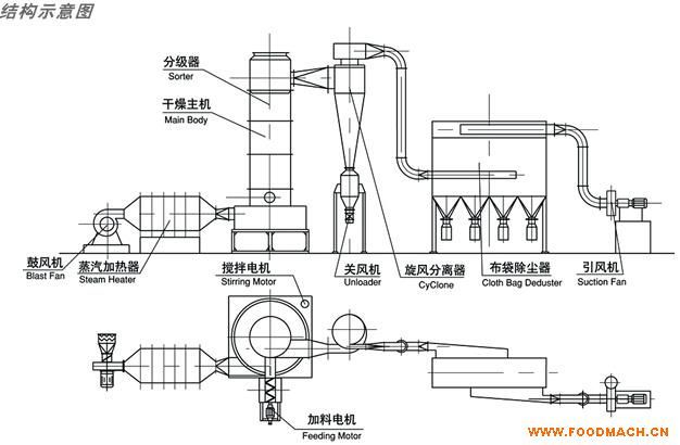 廠家供應(yīng)氣流干燥機(jī)組,使其瞬間得到干燥,干燥的淀粉經(jīng)旋風(fēng)分離器、關(guān)風(fēng)器排出,廢氣經(jīng)風(fēng)機(jī)排入大氣。