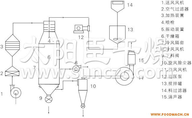 廠家生產(chǎn)干燥器蛋白質(zhì)專用噴霧干燥器,成品連續(xù)地由干燥塔底部和旋風(fēng)分離器中輸出,廢氣由風(fēng)機排空。