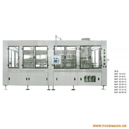 該機集機電一體,沖瓶、灌裝、旋蓋三臺一。可編程序控制控制。以塑料瓶為包裝容器,可生產(chǎn)含氣與不含氣飲料