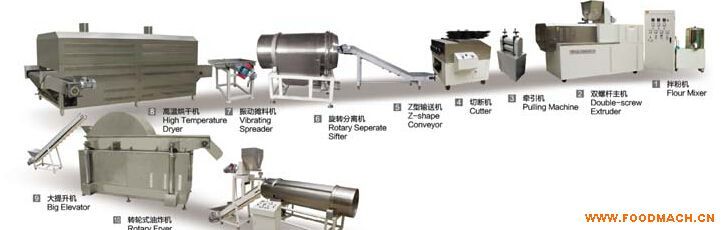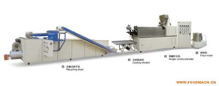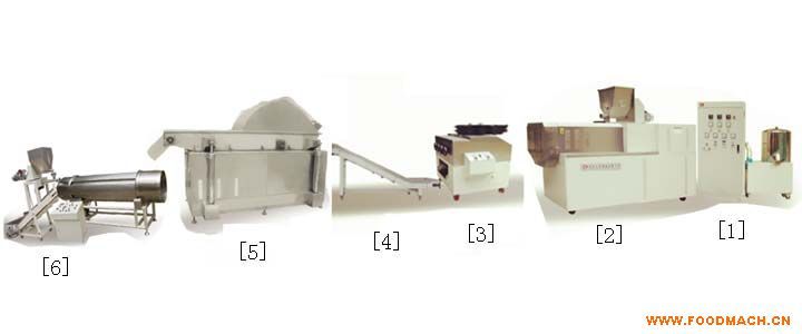 油炸面食生產(chǎn)線以面粉,大米粉及玉米粉為主要原料,采用擠壓成型技術(shù)輔以形狀各異的擠出模具擠出成型