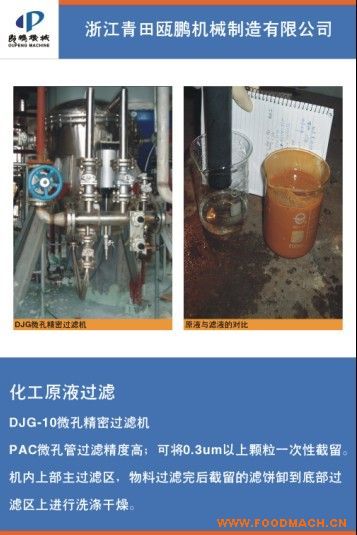 DJG-10精密過濾機PAC微管過濾精密高,可將0.3um顆粒一次性截留,機內(nèi)上部主過濾區(qū)物料過濾后截留的濾餅卸到底部過濾區(qū)上進行...