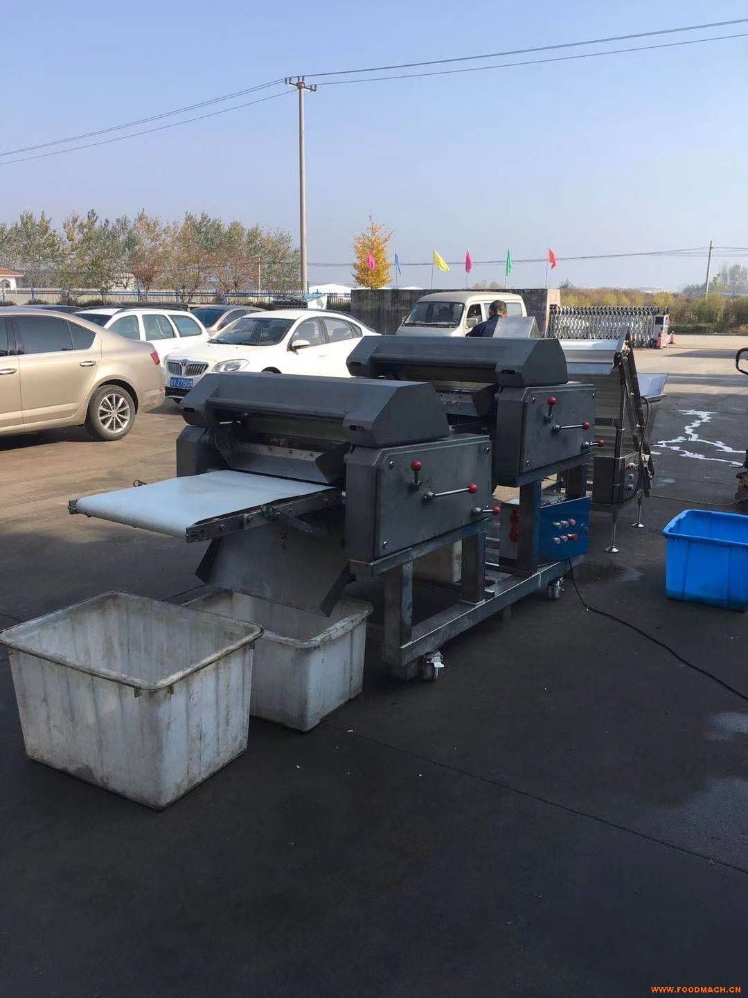 剝皮機設備可對雞脖、雞胸、雞腿、鴨脖、鴨胸帶皮豬肉等動物表皮進行去除,去皮效果好,物料不損傷。此設備可與大型屠宰流水...