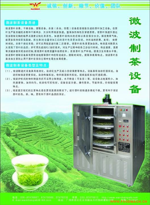 微波茶葉殺青、干燥設(shè)備、提取設(shè)備、殺菌(殺蟲、防霉)設(shè)備是目前*先進(jìn)的茶葉加工設(shè)備,在茶葉生產(chǎn)*關(guān)鍵的殺青和干燥兩步, 充分利用微波快速,整體加熱特性及穿透原理,使茶葉快速升溫達(dá)到多酚氧化酶的臨界點(diǎn)溫度以鈍化其活性,加速茶葉結(jié)構(gòu)水的遷移以蒸發(fā)部分水分,揮發(fā)青草氣味,能更多保持綠茶氨基酸、維生素C的含量使加工后的茶葉色澤更加翠綠,外形自然舒展,美觀; 處理時間短,殺青干燥效率高;并可采用微波進(jìn)行第二次提香,使茶葉的色澤更加自然,特別是對陳茶大大提高了茶葉的品質(zhì);并可用先進(jìn)的PLC自控技術(shù),對生產(chǎn)過程中的各工步運(yùn)行時間、傳送速度、溫度等關(guān)鍵參數(shù)實(shí)現(xiàn)自動控制,提高茶葉處理質(zhì)量和處理效率;改善茶葉生產(chǎn)環(huán)境,提高衛(wèi)生形象水平等。微波茶葉提取設(shè)備具有更有效地提取茶葉中的有效成份,提取時間短、提取率高等特點(diǎn)。微波茶葉殺菌殺蟲主要防止用于茶葉在保存過程中生霉生蟲等現(xiàn)象。