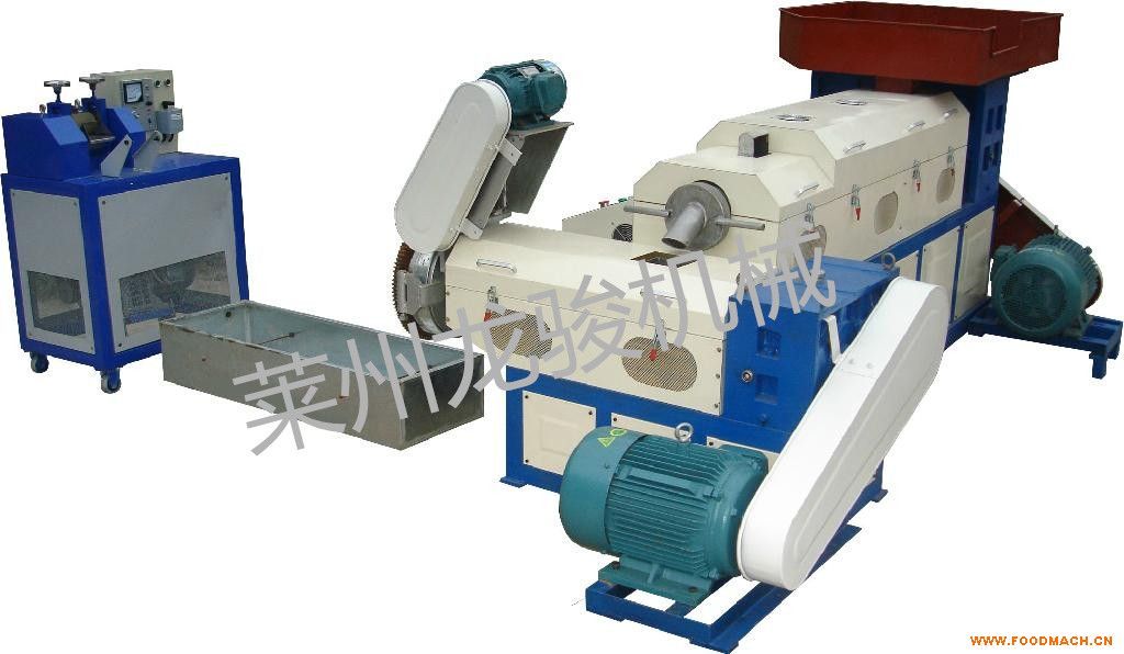 特點:帶水廢舊塑料在制造成品顆粒后表面光潔度更高,經(jīng)過階梯式的兩次排氣后顆粒的含孔率更低,產(chǎn)量 也較同型機組高出10%左右。主機加裝液壓換網(wǎng)模頭后機組可以做到不停機、不斷條、不用人工、沒有機頭 下角料可以持續(xù)使用等優(yōu)點;該機同樣可以選用我廠設(shè)計生產(chǎn)的自動如料機,做到自動輸送、入料、塑化、 排氣、擠出一條龍式生產(chǎn)。機組可“一”字型、左右“T”字型三種擺放方式皆可,節(jié)約了空間,對車間的 要求更寬松。