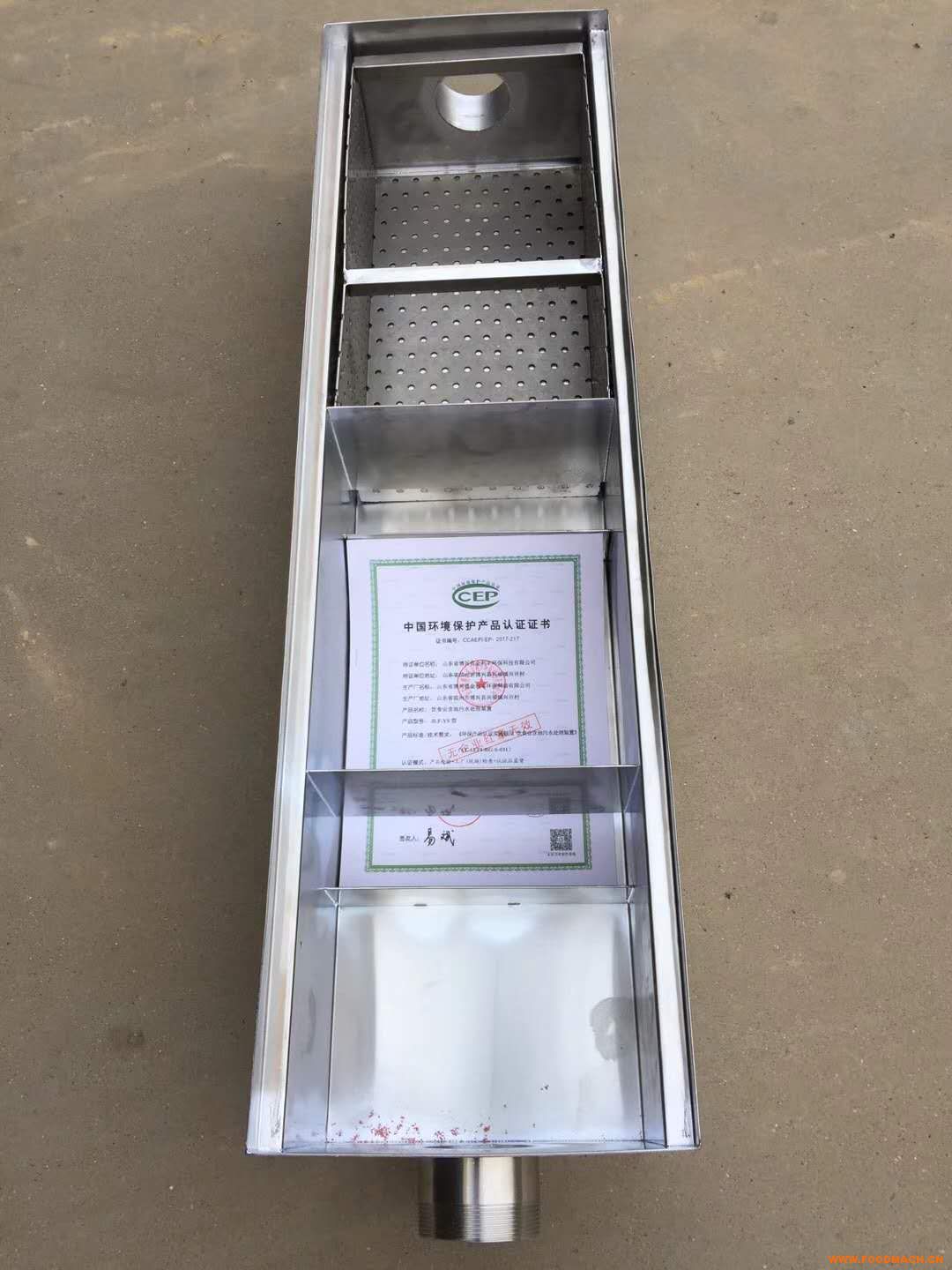 餐廚油水分離器*的三級分離理念:即前端固液分離、中部油水分離和末端深層過濾。防滑箱蓋開啟后,污水經(jīng)入口流入殘渣阻集室,留下固體物質(zhì),污水經(jīng)過隔板下緣流入集油槽,經(jīng)重力分離后大量油脂浮于表面,脫油污水經(jīng)隔板下緣流入集油槽,油脂再次分離上浮表層,脫油污水出口流入國家環(huán)保局規(guī)定的統(tǒng)一規(guī)范的凈水采樣室,便于采樣,經(jīng)排放管排出。整個設(shè)備設(shè)計精細(xì)、合理、效率高,原材料為不銹鋼材質(zhì),經(jīng)久耐用。并且,我廠設(shè)備型號齊全,凈化分離效率高。餐廚油水分離器為箱體結(jié)構(gòu),可埋設(shè)在地下或直接放置于地面上。