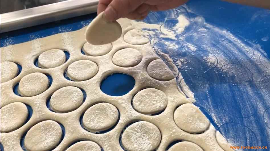 自動撒面粉并滾切甜甜圈。滾切模具可更換,可根據(jù)客戶要求定制模具形狀