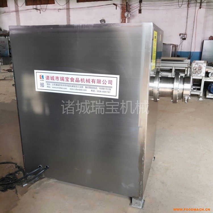 絞肉機(jī)是肉制品生產(chǎn)行業(yè)中通用性高適用范圍廣的一種肉食加工設(shè)備。它是依靠螺桿將料斗箱中的原料肉推到預(yù)切板處,通過(guò)螺桿的旋轉(zhuǎn)擠壓使孔板與絞刀產(chǎn)生相對(duì)運(yùn)轉(zhuǎn),從而將原料肉切成顆粒形狀,確保了肉餡的均勻性。通過(guò)孔板的不同組合可達(dá)到理想要求的不同肉餡。