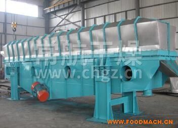 物料自進料進口進入機內(nèi),在振動力作用下,物料沿水平面流化床拋擲,向前連續(xù)運動,熱風(fēng)向上穿過流化床同濕物料換熱后,濕空氣經(jīng)旋風(fēng)分離器除塵后由排風(fēng)1:3排出.干燥物料由排料進口排出。