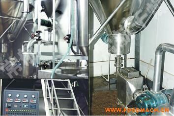 該機采用全封閉形式,所有部件均采用不銹鋼制造,配有三級凈化裝置,過濾后的空氣達十萬級要求。筒體與頂部裝有冷壁裝置,使壁溫<80℃,干燥塔內裝有氣刷掃塔裝置。經(jīng)該機干燥后的中藥浸膏粉,不會出現(xiàn)焦化變質現(xiàn)象,大大增加了收粉率(95%以上),而且不會產(chǎn)生混藥現(xiàn)象和粘壁現(xiàn)象。