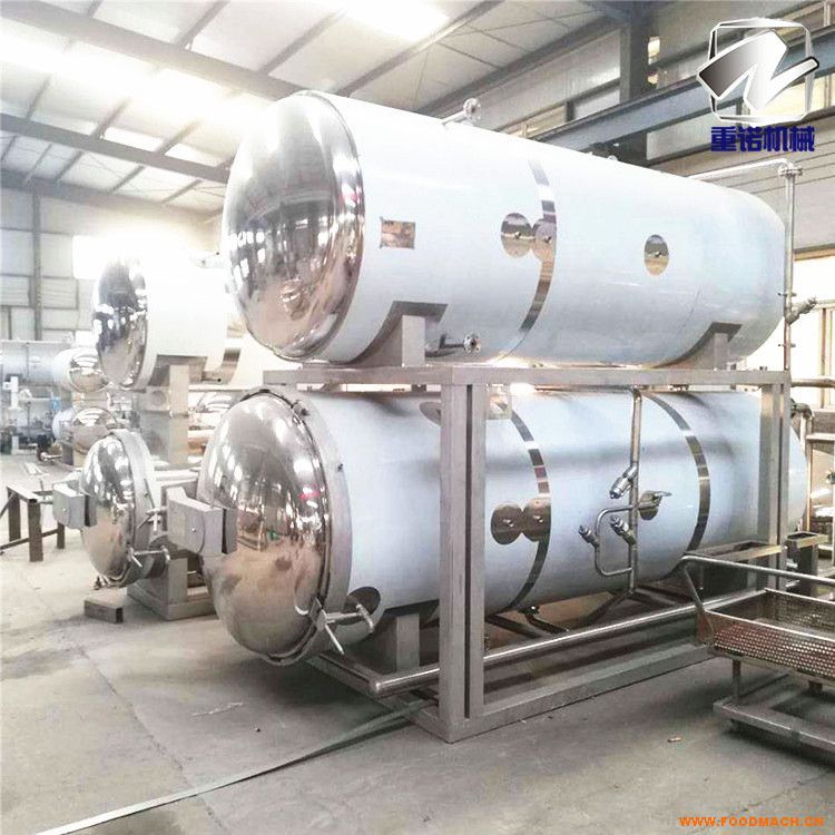 自熱火鍋殺菌鍋 ,粽子高溫蒸煮殺菌鍋 , 雙層水浴式殺菌鍋廠家設備特點:1、升溫快鍋內(nèi)進入少量循環(huán)水,并采用進口高效率換熱器,包裝物在10-15分鐘內(nèi)可以從20度迅速升溫至121度。 2、罐內(nèi)溫度穩(wěn)定、熱分布均一噴淋系統(tǒng)在處理罐內(nèi)每一個托盤的四個角上均設有一系列噴嘴,使霧化熱水與產(chǎn)品充分接觸,從而保證了設備內(nèi)部各點的溫度一致。3、節(jié)約能源蒸汽冷凝水回收系統(tǒng)可直接回收換熱器在加熱過程中產(chǎn)生的冷凝水,并作為滅菌用的循環(huán)水,從而降低了能源的消耗。4、間接加熱和冷卻,阻止二次污染循環(huán)水通過板式熱交換器被間接地加熱或冷卻,鍋內(nèi)循環(huán)水在加熱或冷卻時一直處于無菌狀態(tài),殺菌完畢,鍋內(nèi)表面和包裝袋表面的水滴吹干后,也不會留下白色的水垢小點,粽子殺菌鍋 整個包裝袋透明、干凈,阻止二次污染。5、符合食品安全管理的殺菌設備食品安全管理中,生食與熟食需分離,本設備采用雙開門形式,可把生食進料間與熟食出料間嚴格分開,使其更加符合食品衛(wèi)生安全的管理規(guī)定。