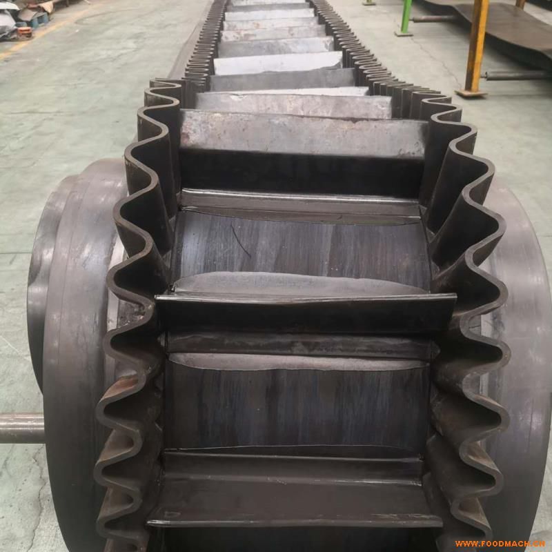 大傾角輸送帶, 是由基帶、擋邊、橫隔板3部分組成。擋邊起防止物料測滑撒落的作用。為便于繞過滾筒,檔邊設(shè)計成波紋狀;橫隔板的作用是承托物料,為了實現(xiàn)大傾角輸送,采用T型TC型。檔邊和橫隔板是用二次硫化的方法與基帶連接的,具有很高的連接強度。用于輸送易散落的粉狀、粒狀、小塊狀、糊狀及液態(tài)狀物料。其特點:適用于傾角0°~90°散裝物料的輸送;具有使用范圍廣、占地面積小、無轉(zhuǎn)運點、減少土建投資、維護費用低、維修容易輸送量大連續(xù)化、高效率、大傾角運輸,操作安全,使用簡便,,運費低廉,并能縮短運輸距離,降低工程造價,節(jié)省人力物力等特點;解決了普通帶和花紋帶所不能達到的輸送角度;還可根據(jù)使用環(huán)境,設(shè)計成完整、獨立的輸送系統(tǒng),避免了間斷輸送和復(fù)雜輸送的提升系統(tǒng)?裳厮、傾斜、垂直和變角方向輸送各種散裝物料,從煤、礦石、沙子到化肥和糧食等。物料粒度不限,可從很小的粒度到400mm的大粒度,輸送量可從1立方米/小時到6000立方米/小時。