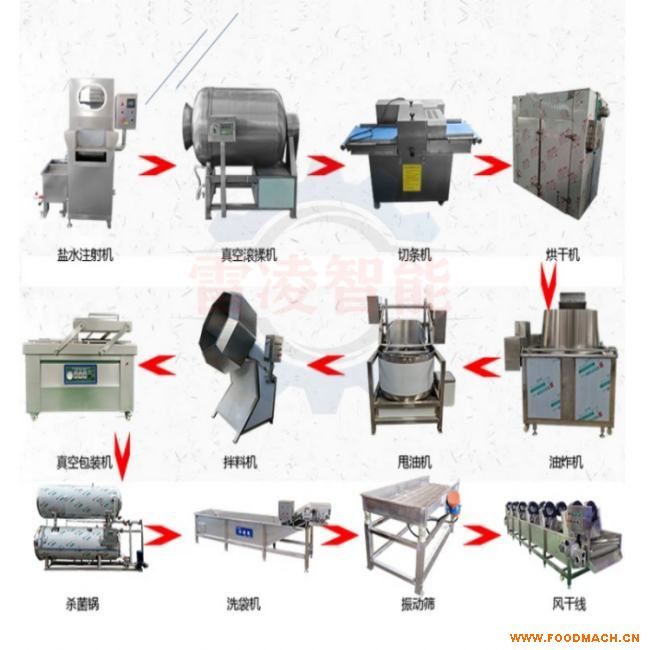 油炸牛肉干加工設(shè)備流程:解凍池→鹽水注射機(jī)→滾揉機(jī)→切條機(jī)(鮮肉)→烘干房→油炸機(jī)→甩油機(jī)→拌料機(jī)→真空包裝機(jī)→殺菌鍋→清洗機(jī)→風(fēng)干機(jī)→成品