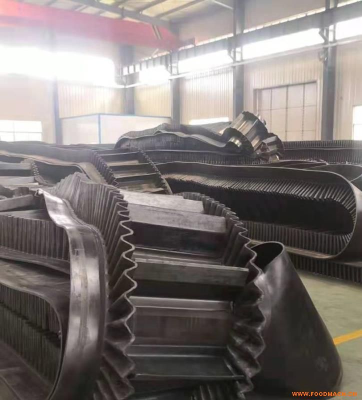 大傾角波紋擋邊帶, 是由基帶、擋邊、橫隔板3部分組成。擋邊起防止物料測(cè)滑撒落的作用。為便于繞過(guò)滾筒,檔邊設(shè)計(jì)成波紋狀;橫隔板的作用是承托物料,為了實(shí)現(xiàn)大傾角輸送,采用T型TC型。檔邊和橫隔板是用二次硫化的方法與基帶連接的,具有很高的連接強(qiáng)度。用于輸送易散落的粉狀、粒狀、小塊狀、糊狀及液態(tài)狀物料。其特點(diǎn):適用于傾角0°~90°散裝物料的輸送;具有使用范圍廣、占地面積小、無(wú)轉(zhuǎn)運(yùn)點(diǎn)、減少土建投資、維護(hù)費(fèi)用低、維修容易輸送量大連續(xù)化、高效率、大傾角運(yùn)輸,操作安全,使用簡(jiǎn)便,,運(yùn)費(fèi)低廉,并能縮短運(yùn)輸距離,降低工程造價(jià),節(jié)省人力物力等特點(diǎn);解決了普通帶和花紋帶所不能達(dá)到的輸送角度;還可根據(jù)使用環(huán)境,設(shè)計(jì)成完整、獨(dú)立的輸送系統(tǒng),避免了間斷輸送和復(fù)雜輸送的提升系統(tǒng)。可沿水平、傾斜、垂直和變角方向輸送各種散裝物料,從煤、礦石、沙子到化肥和糧食等。物料粒度不限,可從很小的粒度到400mm的大粒度,輸送量可從1立方米/小時(shí)到6000立方米/小時(shí)。