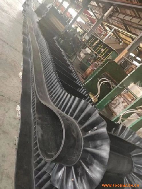 大傾角耐高溫波紋擋邊帶, 是由基帶、擋邊、橫隔板3部分組成。擋邊起防止物料測滑撒落的作用。為便于繞過滾筒,檔邊設計成波紋狀;橫隔板的作用是承托物料,為了實現(xiàn)大傾角輸送,采用T型TC型。檔邊和橫隔板是用二次硫化的方法與基帶連接的,具有很高的連接強度。用于輸送易散落的粉狀、粒狀、小塊狀、糊狀及液態(tài)狀物料。其特點:適用于傾角0°~90°散裝物料的輸送;具有使用范圍廣、占地面積小、無轉(zhuǎn)運點、減少土建投資、維護費用低、維修容易輸送量大連續(xù)化、高效率、大傾角運輸,操作安全,使用簡便,,運費低廉,并能縮短運輸距離,降低工程造價,節(jié)省人力物力等特點;解決了普通帶和花紋帶所不能達到的輸送角度;還可根據(jù)使用環(huán)境,設計成完整、獨立的輸送系統(tǒng),避免了間斷輸送和復雜輸送的提升系統(tǒng)?裳厮、傾斜、垂直和變角方向輸送各種散裝物料,從煤、礦石、沙子到化肥和糧食等。物料粒度不限,可從很小的粒度到400mm的大粒度,輸送量可從1立方米/小時到6000立方米/小時。