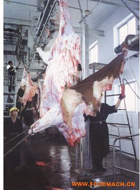 自動(dòng)剝皮機(jī)的驅(qū)動(dòng)有電動(dòng)和液壓兩種。家畜經(jīng)預(yù)剝皮工序后,用該機(jī)器一次性自動(dòng)將皮剝?nèi)ァIa(chǎn)效率高。