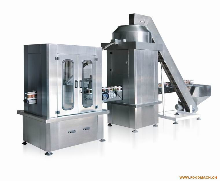 通過光電開關(guān)配合,PLC電腦編程自動控制整個壓蓋流程動作, 自動配蓋,有罐配蓋/無罐不配蓋,卡罐、缺蓋自動停機(jī)報警,自動聯(lián)線控制自動分罐裝置和罐體防倒定位裝置 、自動分蓋配送及同步等速自動壓蓋