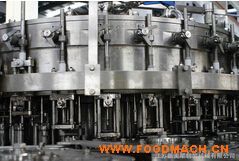 該機的生產(chǎn)過程如下:風(fēng)送道中的瓶子通過分瓶星輪由瓶夾式進瓶撥輪傳送至三合一灌裝機的沖瓶機上。沖瓶機的回轉(zhuǎn)盤上裝有卡瓶口式不銹鋼瓶夾,瓶夾夾住瓶頸沿一導(dǎo)軌翻轉(zhuǎn)180°使瓶口向下。在沖瓶機的特定區(qū)域,特制噴嘴噴出沖瓶水,對瓶子內(nèi)壁進行沖洗,同時對瓶子外壁也進行沖洗。瓶子經(jīng)沖洗、瀝干后在瓶夾夾持下沿導(dǎo)軌再翻轉(zhuǎn)180°使瓶口向上。洗凈后的瓶子通過瓶夾式過渡撥輪由沖瓶機導(dǎo)出并傳送至灌裝機。進入灌裝機的瓶子由提升氣缸上的瓶夾卡住瓶口保持,并在凸輪作用下實現(xiàn)上升與下降。灌裝機采用等壓灌裝方式,當(dāng)瓶子由提升氣缸頂?shù)介y上時,檢測裝置檢測到有瓶。開氣閥接受到有瓶信號之后,延時打開,CO2背壓管路接通,直至瓶內(nèi)壓力與缸內(nèi)壓力相等開始灌裝,灌入瓶內(nèi)的物料將CO2排出,并通過排氣管返回缸中,當(dāng)不斷增加的液面將排氣管封死,瓶內(nèi)壓力高于缸內(nèi)壓力時,就停止灌裝了,灌裝過程結(jié)束以后,由閉閥凸輪將灌裝閥機械地關(guān)閉。通過排氣凸輪將瓶頸處的CO2慢慢泄放出來(注意排氣時不要太快,否則易泛泡),至此結(jié)束灌裝。灌裝結(jié)束后瓶口下降離開灌裝閥,瓶子通過瓶夾式過渡撥輪進入旋蓋機。旋蓋機上的止旋刀卡住瓶頸部位,保持瓶子直立并防止旋轉(zhuǎn)。旋蓋頭在旋蓋機上保持公轉(zhuǎn)并自轉(zhuǎn),在凸輪作用下實現(xiàn)抓蓋、套蓋、旋蓋、脫蓋動作,完成整個封蓋過程。成品瓶通過出瓶撥輪從旋蓋機傳送到出瓶輸送鏈上,由輸送鏈傳送出三合一灌裝機。