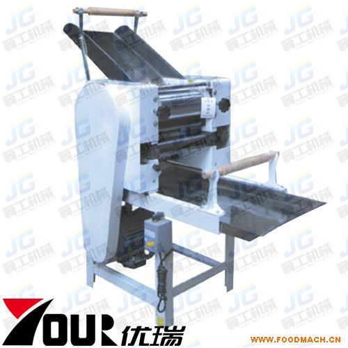 4.軋面:先拆下切面刀,調(diào)節(jié)壓面輥二頭的調(diào)節(jié)器,將兩面輥間隙調(diào)為2.5-3mm,將插頭插入220V電源的插座內(nèi),按下機器上的開關(guān),把和好的面片放入面斗上,引入壓面輥之間,反復輥制4-5次,*后調(diào)節(jié)面輥間隙1.5mm,復壓一次。