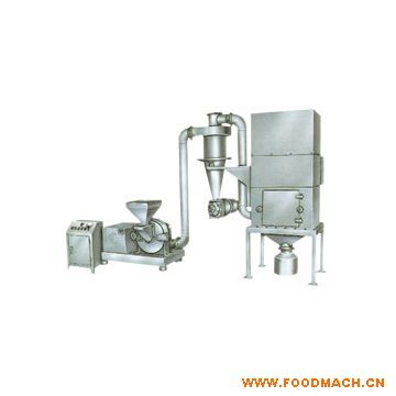 該機有粉碎主機、旋風(fēng)分離器、脈沖除塵箱等部分組成。物料由加料斗進(jìn)入粉碎室,通過高速旋轉(zhuǎn)的錘片進(jìn)行粉碎,粉碎細(xì)度可調(diào)節(jié)分級刀與分級盤的距離來達(dá)到所需要的細(xì)度,粉碎好的物料經(jīng)轉(zhuǎn)離心力和引風(fēng)機的作用進(jìn)入旋風(fēng)分離器,然后,通過關(guān)風(fēng)機出料,粉塵進(jìn)入脈沖除塵箱,經(jīng)過過濾筒過濾后回收利用。該機按“GMP”標(biāo)準(zhǔn)設(shè)計,整機全部用不銹鋼材料制造,粉碎過程中無粉塵飛揚。