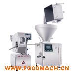 葉片真空定量灌裝機(jī) 采用葉片泵灌裝、日本進(jìn)口伺服電機(jī)驅(qū)動(dòng)、人機(jī)界面、可編程控制器(PLC)控制的全自動(dòng)真空定量灌裝機(jī),配裝有自動(dòng)扭結(jié)裝置和200L提升機(jī)。即可灌制肉糜腸、火腿腸、火腿等腸衣制品;又適用于天然腸衣、膠原蛋白腸衣、纖維腸衣等分份扭結(jié)。也可用于灌裝各種盒裝、瓶裝產(chǎn)品。泵體設(shè)有容量自動(dòng)補(bǔ)償結(jié)構(gòu)和葉片自動(dòng)補(bǔ)償裝置,使分份定量精度±4g。灌裝速度、灌裝重量、扭結(jié)速度、扭結(jié)圈數(shù)均可在觸摸屏上設(shè)定。