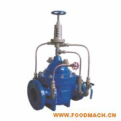 當(dāng)閥門從進(jìn)口端給水時(shí),水流過針閥進(jìn)入主閥控制室,并經(jīng)過導(dǎo)閥、球閥流出主閥控制室到出口,此時(shí)主閥處于全開或浮動狀態(tài)。調(diào)定主閥上部的流量調(diào)節(jié)閥,可為主閥設(shè)定一定開度。調(diào)節(jié)針閥開度和調(diào)節(jié)導(dǎo)閥彈簧壓力,即可使主閥開度保持在設(shè)定開度,并在壓力變化時(shí)導(dǎo)閥進(jìn)行自動調(diào)節(jié),保持流量不變。