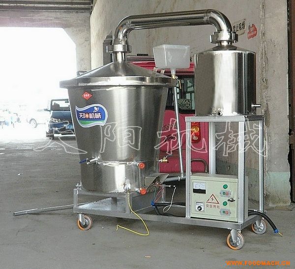 純糧放心酒蒸酒設(shè)備為分體式結(jié)構(gòu),由蒸筒,鍋蓋,導(dǎo)氣管和套管式冷卻器組成,純不銹鋼制造,干凈衛(wèi)生,經(jīng)久耐用,不會(huì)產(chǎn)生對(duì)人體有害的鉛、鋁等物質(zhì),蒸鍋為雙層底結(jié)構(gòu),采用燃?xì)饣螂娂訜岱绞,把底鍋中的水加熱形成蒸汽,由蒸汽?dǎo)管進(jìn)入上鍋內(nèi)加熱發(fā)酵好的酒料進(jìn)行蒸酒,可以有效防止了糊鍋焦鍋現(xiàn)象。冷凝器為陣式套管狀的冷卻結(jié)構(gòu),在減小冷卻器體積的同時(shí),大大增加了冷熱交換面積,冷卻效果好,出酒率高,為家庭釀制純糧白酒的理想加工設(shè)備。