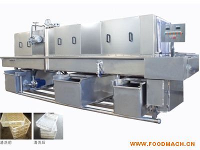 需清洗的周轉(zhuǎn)筐由不銹鋼鏈條輸入清洗機(jī)中,依次通過加溫老堿水→高壓熱水→常溫自來水→消毒水→常溫風(fēng)刀去水等多道工序,將筐子清洗干凈,同時完成殺菌及風(fēng)干;特殊筐子清洗時可在熱堿水清洗段后加配毛刷,對筐子底部及左右兩側(cè)進(jìn)行刷洗,提高清洗效果;采用連續(xù)式清洗,以提高清洗效率;