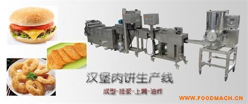 生產(chǎn)線工藝流程:全自動(dòng)肉餅成型機(jī)----上漿機(jī)----上面包屑機(jī)