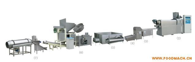 原料混合----成型擠出熟化----切斷----產(chǎn)品干燥-----油炸膨化----產(chǎn)品調(diào)味