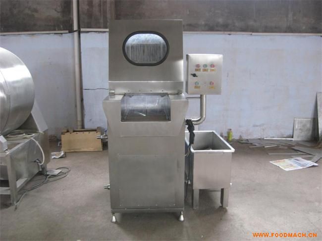 鹽水注射機(jī)是將鹽水及輔料通過(guò)鹽水注射、真空滾揉,注入肉中的料液充分腌漬,滲透,疏松肌肉組織結(jié)構(gòu),有利于肌球蛋白溶出,并且由于添加劑對(duì)原料肉離子強(qiáng)度的增強(qiáng)作用和蛋白等特點(diǎn)的調(diào)整作用,注入配制的水溶液能使肉質(zhì)嫩化、松軟,從而提高了肉制品的出品率和改善肉制品的嫩度和口感。