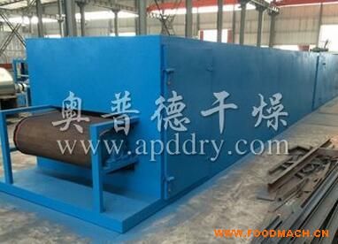 物料由加料器均勻地鋪在網(wǎng)帶上,網(wǎng)帶一般采用12-60目不銹鋼絲網(wǎng),由傳動(dòng)裝置拖動(dòng)在干燥機(jī)內(nèi)移動(dòng)。干燥機(jī)由若干單元組成,每一單元熱風(fēng)獨(dú)立循環(huán),部分尾氣由專門排濕風(fēng)機(jī)排出,廢氣由調(diào)節(jié)閥控制,熱氣由下往上或由上往下穿過鋪滿物料的網(wǎng)帶完成熱量與質(zhì)量傳遞的進(jìn)程,帶走物料水份。網(wǎng)帶緩慢移動(dòng),運(yùn)行速度可根據(jù)物料溫度自由調(diào)節(jié),干燥后的成品連續(xù)落入收料器中。上下循環(huán)單元根據(jù)用戶需要可靈活配備,單元數(shù)量亦可根據(jù)需要選取。