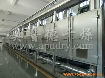 物料由加料器均勻地鋪在網(wǎng)帶上,網(wǎng)帶一般采用12-60目不銹鋼絲網(wǎng),由傳動裝置拖動在干燥機(jī)內(nèi)移動。干燥機(jī)由若干單元組成,每一單元熱風(fēng)獨(dú)立循環(huán),部分尾氣由專門排濕風(fēng)機(jī)排出,廢氣由調(diào)節(jié)閥控制,熱氣由下往上或由上往下穿過鋪滿物料的網(wǎng)帶完成熱量與質(zhì)量傳遞的進(jìn)程,帶走物料水份。網(wǎng)帶緩慢移動,運(yùn)行速度可根據(jù)物料溫度自由調(diào)節(jié),干燥后的成品連續(xù)落入收料器中。上下循環(huán)單元根據(jù)用戶需要可靈活配備,單元數(shù)量亦可根據(jù)需要選取。