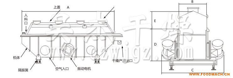 物料自進(jìn)料進(jìn)口進(jìn)入機(jī)內(nèi),在振動(dòng)力作用下,物料沿水平面流化床拋擲,向前連續(xù)運(yùn)動(dòng),熱風(fēng)向上穿過(guò)流化床同濕物料換熱后,濕空氣經(jīng)旋風(fēng)分離器除塵后由排風(fēng)1:3排出.干燥物料由排料進(jìn)口排出。